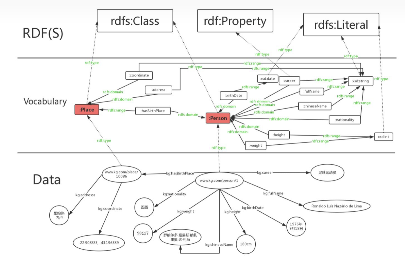 RDF在设计上的主要特点是易于发布和分享数据,但RDF的表达能力有限,无法区分类和对象,也无法定义和描述类的关系/属性。RDF是对具体事物的描述,缺乏抽象能力,无法对同一个类别的事物进行定义和描述。例如罗纳尔多和里约热内卢这两个实体,RDF能够表达罗纳尔多和里约热内卢这两个实体具有哪些属性,以及它们之间的关系。但如果我们想定义罗纳尔多是人,里约热内卢是地点,并且人具有哪些属性,地点具有哪些属性,人和地点之间存在哪些关系,这个时候RDF就表示无能为力了。不论是在智能的概念上,还是在现实的应用当中,这种泛化抽象能力都是相当重要的;同时,这也是知识图谱本身十分强调的。RDFS和OWL这两种技术或者说模式语言/本体语言(schema/ontology language)解决了RDF表达能力有限的困境。